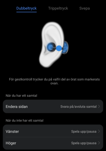 Volume adjustment is performed by swiping up or down on the portion behind the ear. This method is highly effective and intuitive. By omitting a single-tap option for playback control, the risk of accidental song changes or similar actions, when merely adjusting the fit, is significantly reduced.