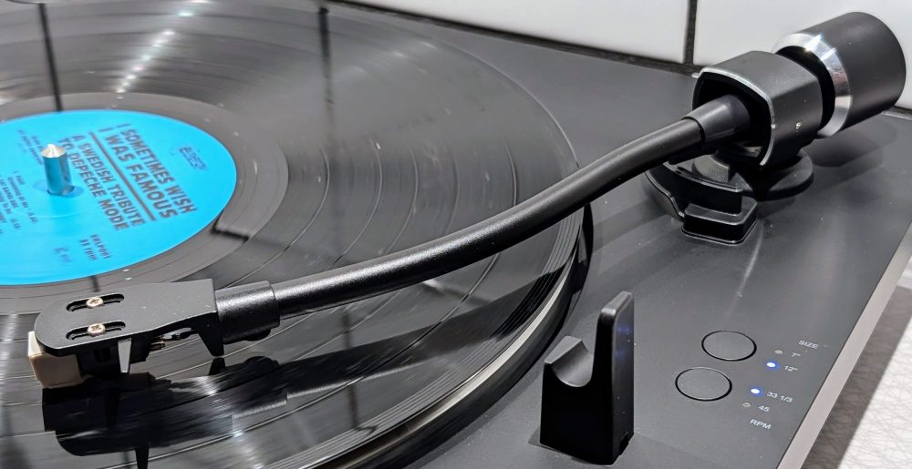 The S-shaped metal design of the tonearm is aesthetically pleasing and robust. However, it is important to note that the counterweight is fixed. Consequently, manual adjustments for tracking force or anti-skating are not possible. This presents a clear limitation for users intending to upgrade the cartridge in the future. Nevertheless, for individuals primarily seeking a Bluetooth-enabled LP player, cartridge upgrades are typically not a primary consideration.
